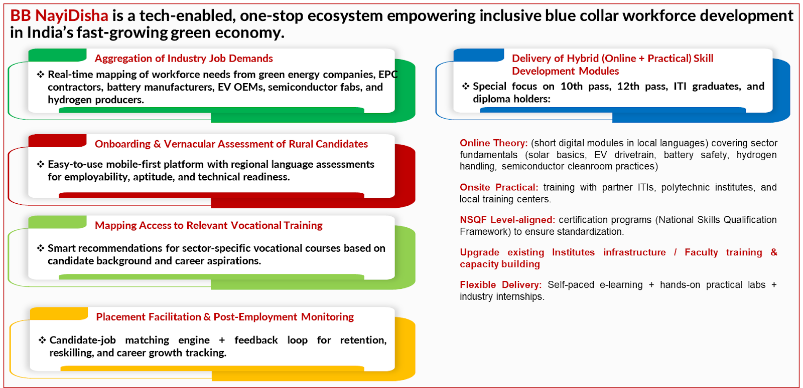 Tailored for Industry & Rural Impact- Customized Training Modules aligned with real-time workforce needs in solar, EV, wind, hydrogen, and semiconductor sectors. Ready-to-Deploy Talent for corporate partners with trained candidates from Tier-2/3 towns and rural belts. Employment-Linked Skilling ensuring industries get reliable manpower and rural candidates receive guaranteed livelihood pathways.